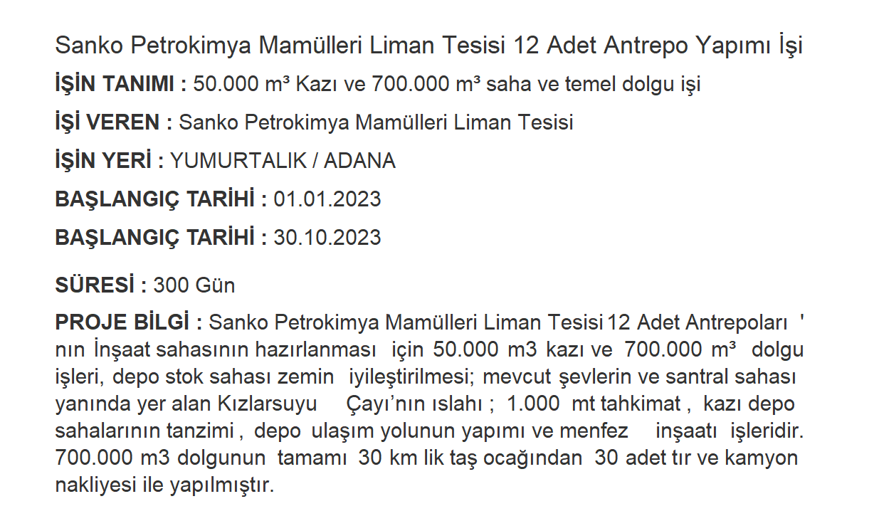 Sanko 12 Adet Antrepo yapımı Kazı 50.000 m³ Dolgu 700.000 m³ İş bitimi 9 ay